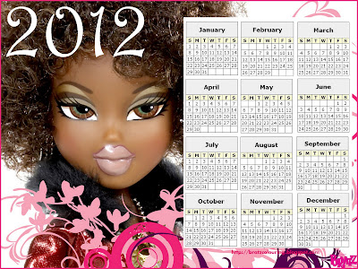 Here is a 2012 Bratz calendar for you to print and put up in your room or locker - it shows the beautiful Sasha who is Bratz's African American ethnic doll. I hope you enjoy having this calendar for the next 12 months! It's free and printable - just click on the calendar and it will open full size - then either print it, save it or set it as the background on your desktop if you wish!