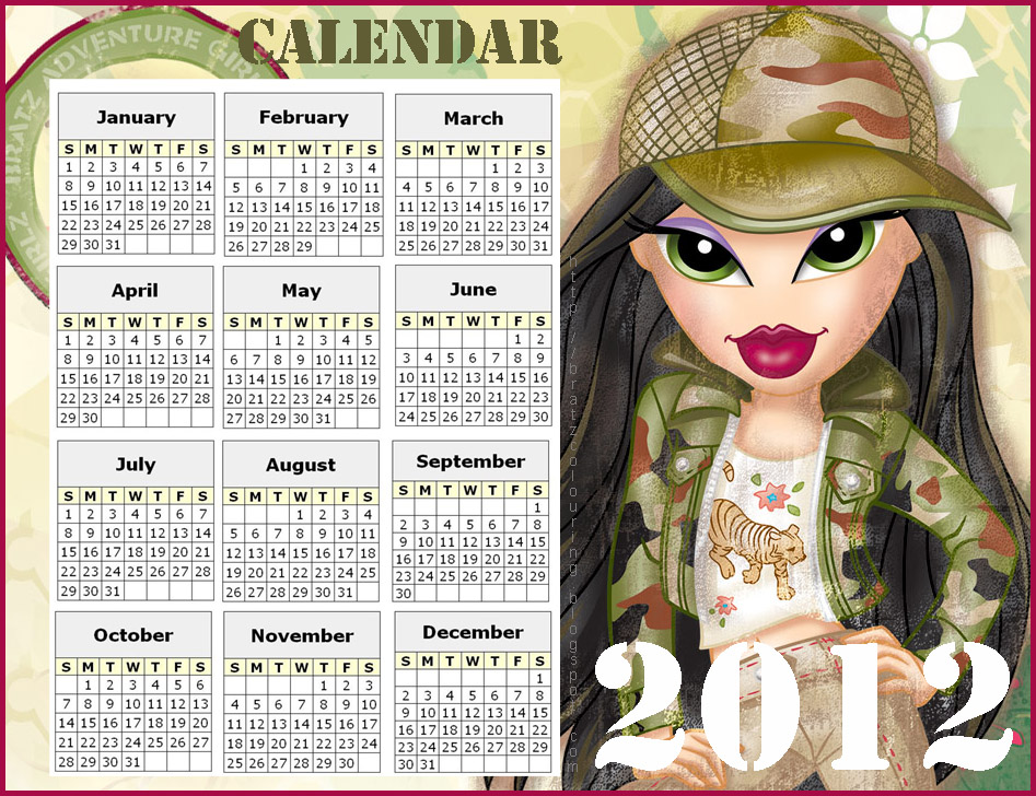 Bratz calendar for 2012 - if this is what you have been searching for - then here you are - you have found it - click on the 2012 Bratz calender (AND THE BRATZ YOU SEE ON IT IS JADE BY THE WAY) to see it full size - it's a lovely big image when it opens - then either print it or save it to your PC. I LOVE THE SAFARI THEME OF THIS FREE, PRINTABLE BRATZ 2012 CALENDAR!